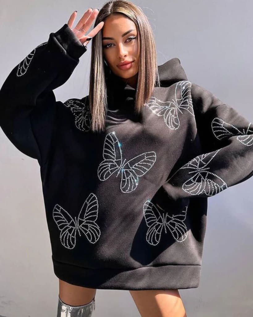 Diamond Butterfly Long Sleeve Loose Hoodie Dress