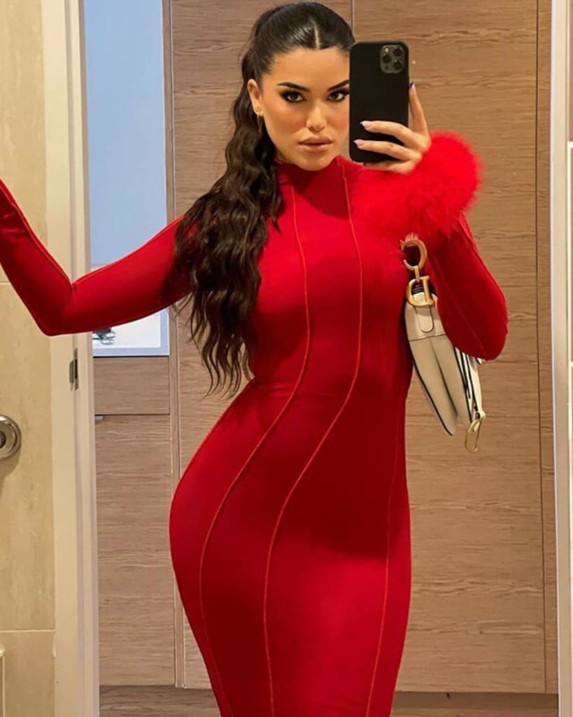 Sexy Feather Long Sleeve O-Neck Red Dress